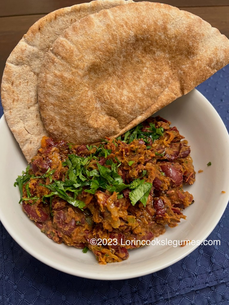 I served these with store bought pita bread. I think that the traditional flat bread in Yemen is actually something called malawach, which is flaky and fatty, made with a layered dough like a croissant. It sounds delicious, but I didn’t feel like turning this nice quick canned bean recipe into a cooking project that would take all evening.