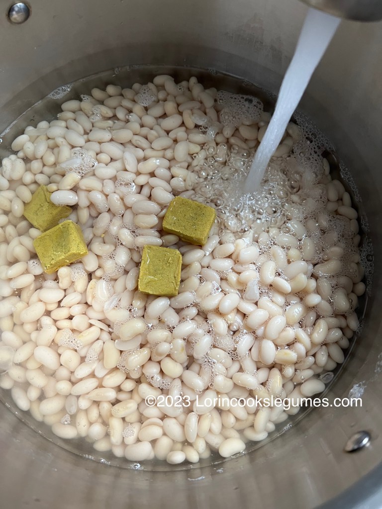 Drain the beans and return them to the pan, along with the bouillon cubes and enough water to cover the beans by 1 inch. Bring to a boil, reduce heat to a simmer, and cook for about 30 minutes, until beans are just tender.