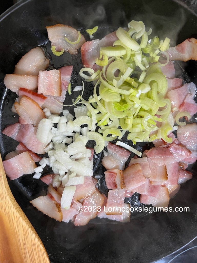 Put the bacon in a skillet over medium heat and cook until it starts to render. Add the onion and leeks, and cook until the onion is soft and the bacon begins to crisp. Drain off any excess fat and set aside.