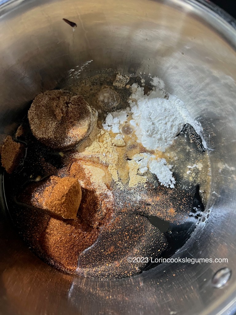 Combine brown sugar, spices, molasses, maple syrup, vinegar, ketchup, tomato sauce and liquid smoke in a sauce pan. In a small bowl, mix the cornstarch with about ½ cup of the water, making sure there are no lumps. before adding it to the pan, along with remaining water. Bring the mixture to a boil, reduce the heat, and simmer, stirring, for 2-3 minutes until the brown sugar is dissolved.
