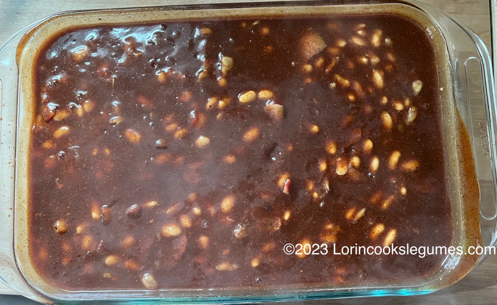 When the beans are just tender, drain them and put them in the prepared baking dish, along with the bacon and onions. Pour the sauce over the beans and stir. It will be quite soupy at this stage, but it will reduce down to a nice sauce as it bakes. Cover with foil and bake for 2 ½ hours. Check every hour or so and give it a stir. Remove the foil and continue to bake until the sauce is reduced to your desired consistency and the top is nicely browned, about 30-90 minutes longer.