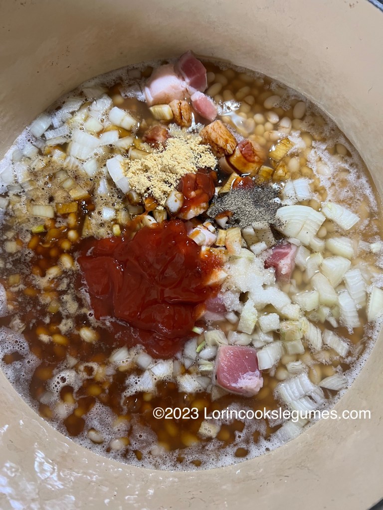 Add the remaining ingredients and stir well. Return to a boil, cover, and transfer to the oven. Bake for about 4 hours and 15 minutes. Stir the beans every hour or so, and add additional boiling water as needed to keep the beans submerged.