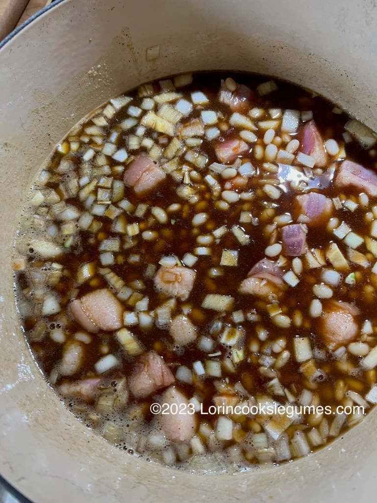 Although Wikipedia says this is made with bacon, the recipes I looked at all called for either salt pork or pork belly ham (which I suppose is basically smoked bacon?) At least one of the salt pork versions specified to use the salt pork “without the lean streak”. Here in the upper midwest there isn’t much choice when it comes to salt pork; I used the Hormel salt pork that is the only variety I’ve ever seen around here, which does have some lean in it.
