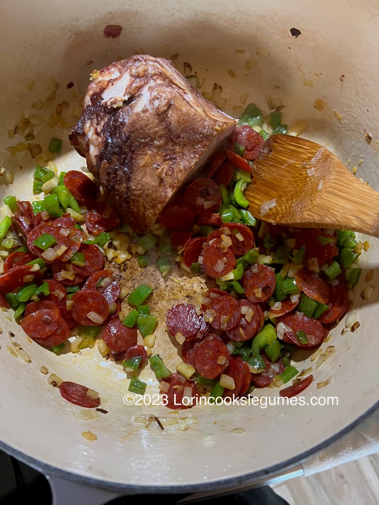 Add the chorizo and ham hock or diced ham, and continue to sauté until chorizo just begins to brown, about 5 minutes.