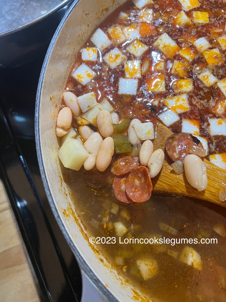 Caldo Gallego contains beans, smoked pork, chorizo, potatoes, turnips and some variety of greens, traditionally the leaves from the turnips. It’s a close cousin to Portugal’s famous caldo verde, or green soup.