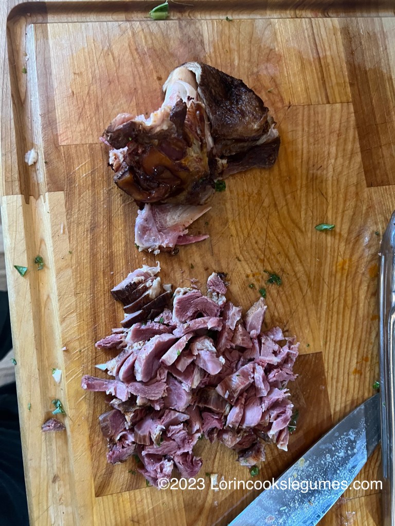 When the ham hock is cool enough to handle, pick the meat off the bones, chop it into bite size pieces and return them to the pot. Discard the skin and bones.