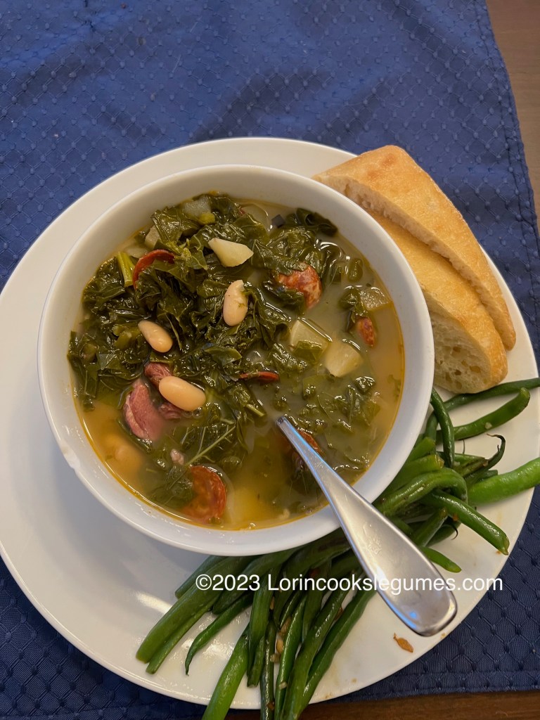 As I said traditionaly the greens from the turnips that go in the soup are used, but just about any hearty green can be substituted. I used both turnip greens and kale, which made for a soup that was pretty heavy on the greens. You could just use one or the other if you prefers less leaves in your soup.