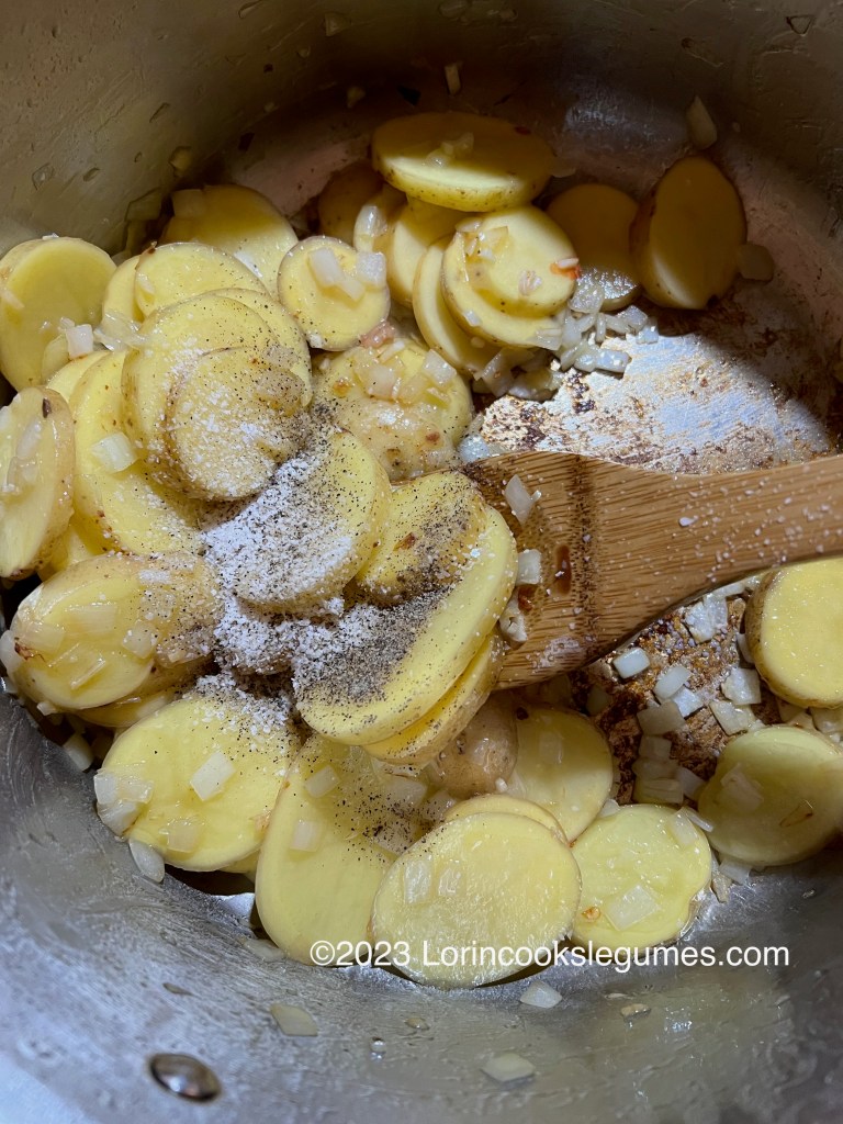 Add the onion and garlic to the fat in the pan and sauté until translucent, 3-5 minutes. Add the potatoes and stir until well coated with oil. Add salt, pepper and water or chicken stock. Bring to a boil, reduce heat and simmer until potato is soft, 20-30 minutes.
