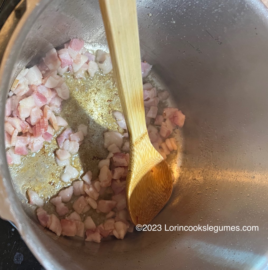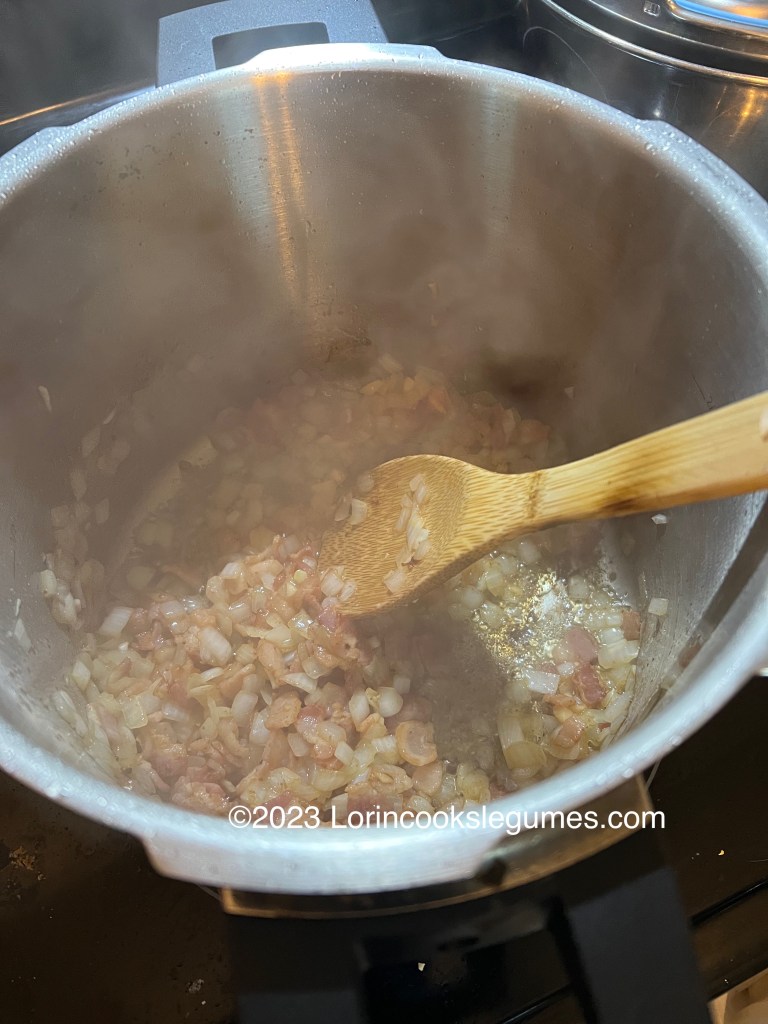 Heat olive oil in a pressure cooker over medium heat. Add the sausage and cook until it begins to brown, 5 minutes or so. Remove sausage to a plate and set aside. Add the bacon to the pan, and cook until the fat begins to render. Add the onion and garlic and sauté until it begins to brown, 5-10 minutes.