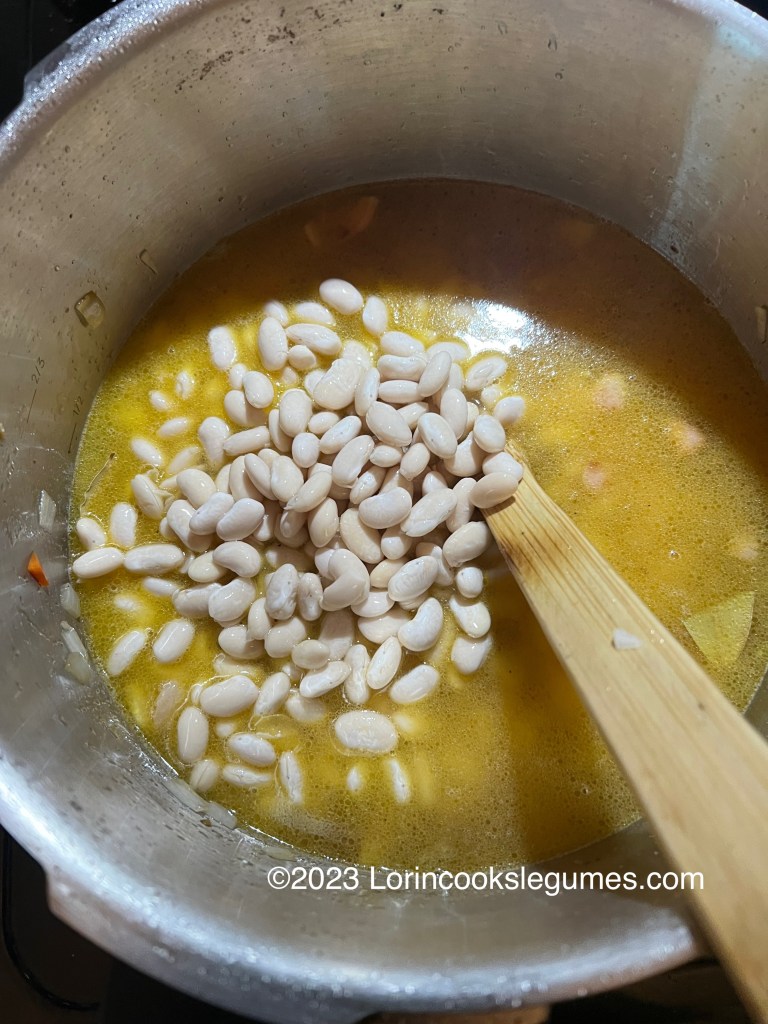 If using dry beans, pick over your beans, removing any bad beans or foreign objects. Rinse, drain, cover with cool water and leave to soak overnight.