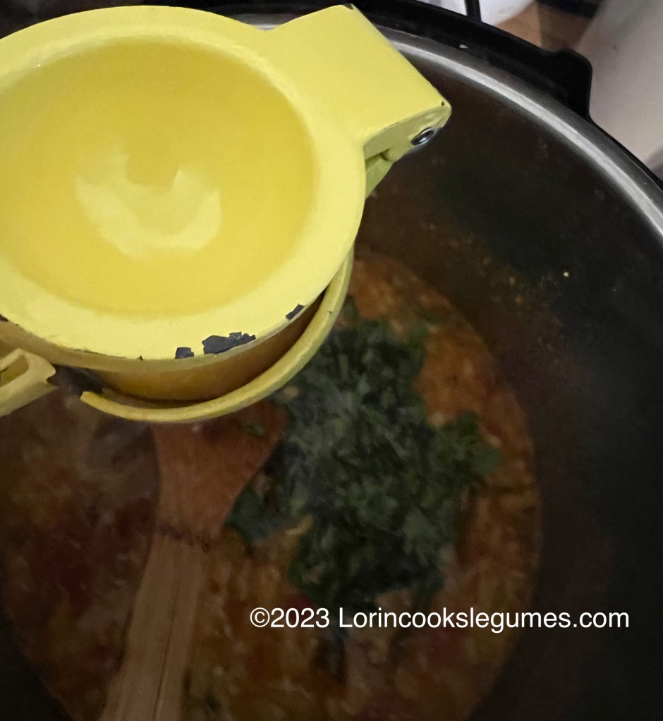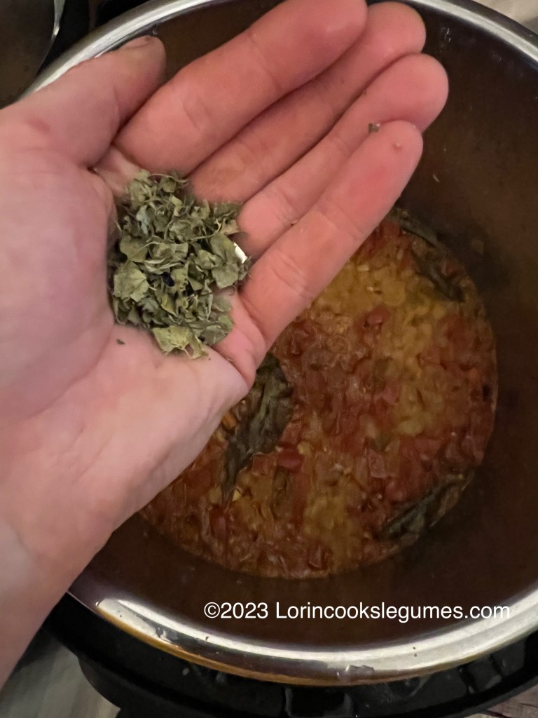 Carefully open the cooker. Crush kasuri methi between your palms and stir into the dal. Add cilantro and lemon juice. Stir well. Taste for salt.