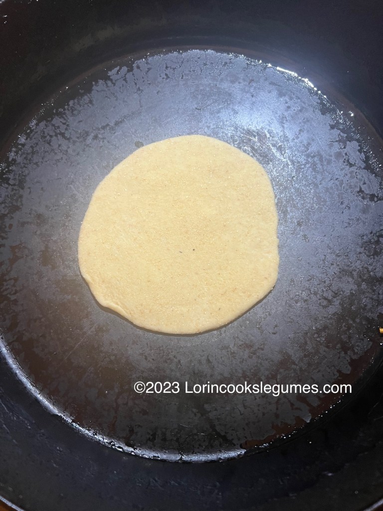 Lightly flatten a ball of dough between your hands, and then put it onto a plate with a little flour, flipping it to lightly dust all sides with flour. Place on a work surface and use a rolling pin to roll it out to a 5-6 inch circle of even thickness. With practice, your dough should naturally move in a circle as you move the rolling pin back and forth (this was the part I was most shocked to see happening with my limited rolling skills). If you haven’t figured that out you can also manually turn and flip the dough so that it rolls evenly. If it starts to stick to the rolling pin or counter, dredge it in the flour again. You want your dough thin, but not paper thin. If it’s too thin it won’t puff, but too thick it will take too long to cook and wind up tough and chewy. I chose to roll all my roti before I started cooking, but with practice, you should be able to roll one while the previous one cooks.