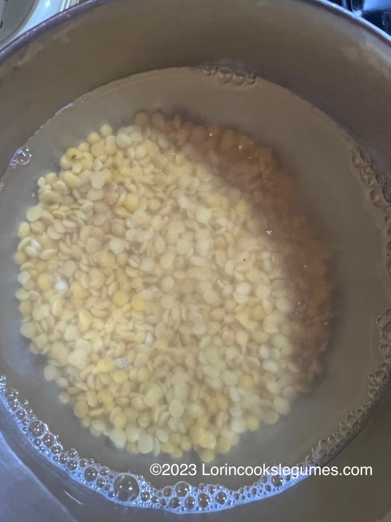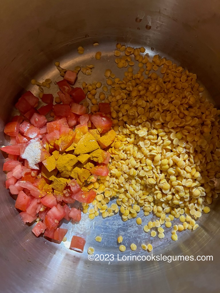 Rinse the dal in cool water, drain, cover with fresh water and allow to soak for 30 minutes. Drain again and place in pressure cooker with 2 cups of fresh water, turmeric, ⅛ teaspoon asafoetida, and diced tomato. Seal cooker and cook at high pressure for about 9 minutes. Allow pressure to release naturally, then lightly mash the cooked dal.