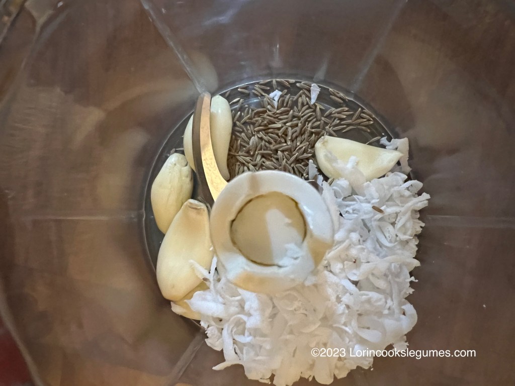 Meanwhile place 5 cloves of garlic, the coconut, and ½ teaspoon cumin seeds in a blender and grind to a paste.