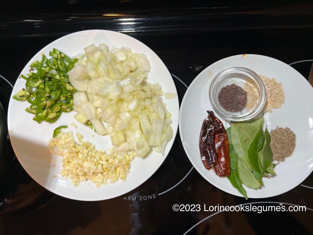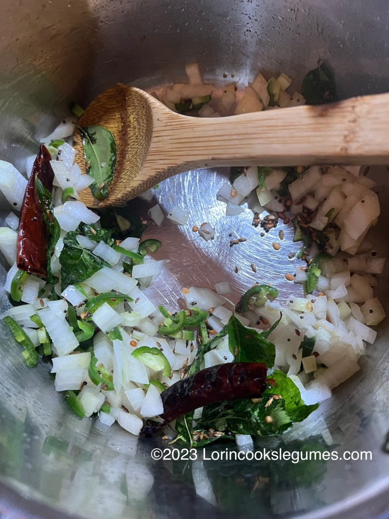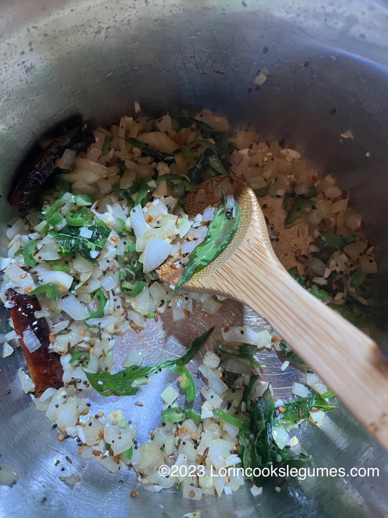 Heat the oil in a large pan over medium heat. Add the mustard seeds and cook until they pop, about 30 seconds. Add the urad dal and ½ teaspoon cumin seed and cook until golden brown. Add the curry leaves, ¼ teaspoon asafoetida, and dried chilies. Cook until the curry leaves crisp, about 1 minutes. Add green chilies and onion and sauté until onion is translucent, about 5 minutes. Add 5 cloves of minced garlic and sauté for 1 mintue longer. Pour into the dal and mix well.