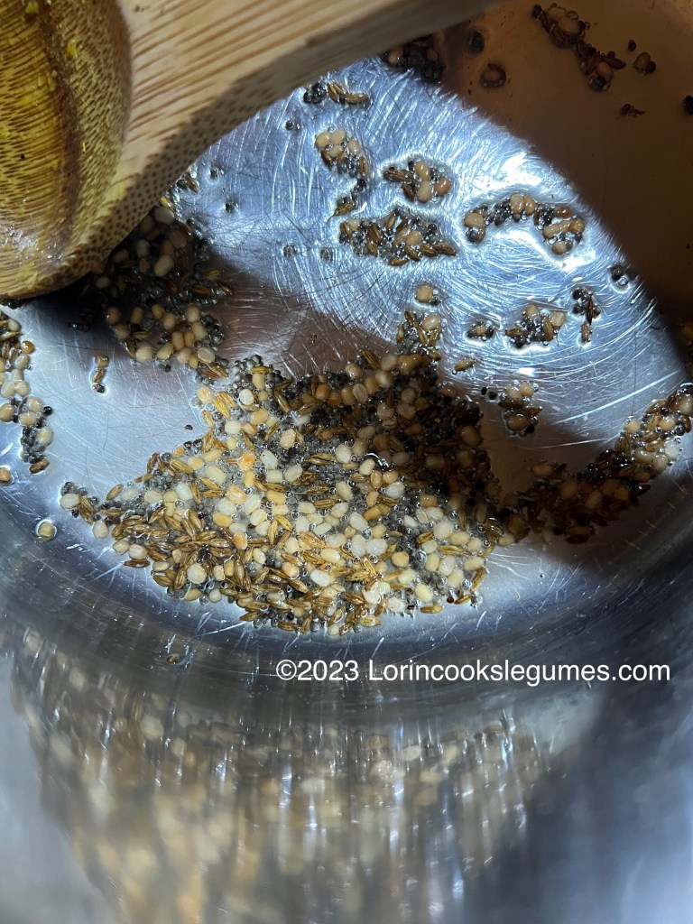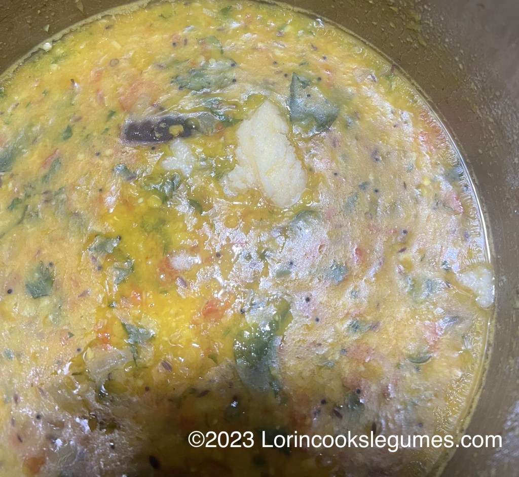 Return the dal to the heat, adding additional water as needed to reach desired consistency. Stir in the coconut mixture and simmer for a couple of minutes.