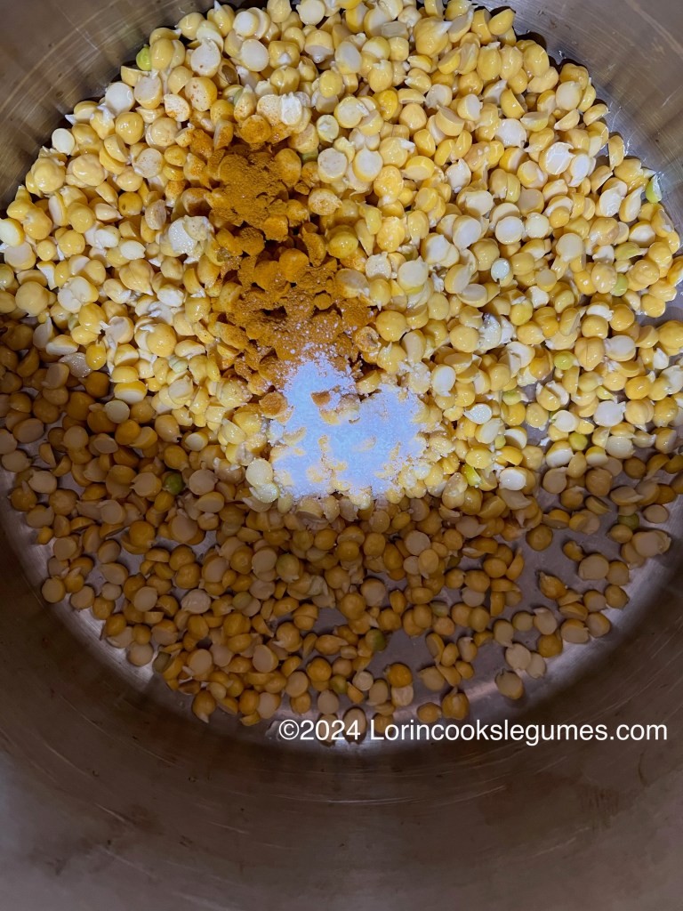 Drain dal and place in a pressure cooker, with 3 cups of water, ½ teaspoon turmeric and ½ teaspoon salt. Seal the pressure cooker and bring up to high pressure. Turn heat to low and cook for 10-12 minutes, then remove from heat and allow the pressure to reduce naturally. When you can safely open the cooker, check your dal. It should retain it’s shape, but mash easily between your thumb and finger. If it is not yet soft, bring back to pressure for a couple more minutes.