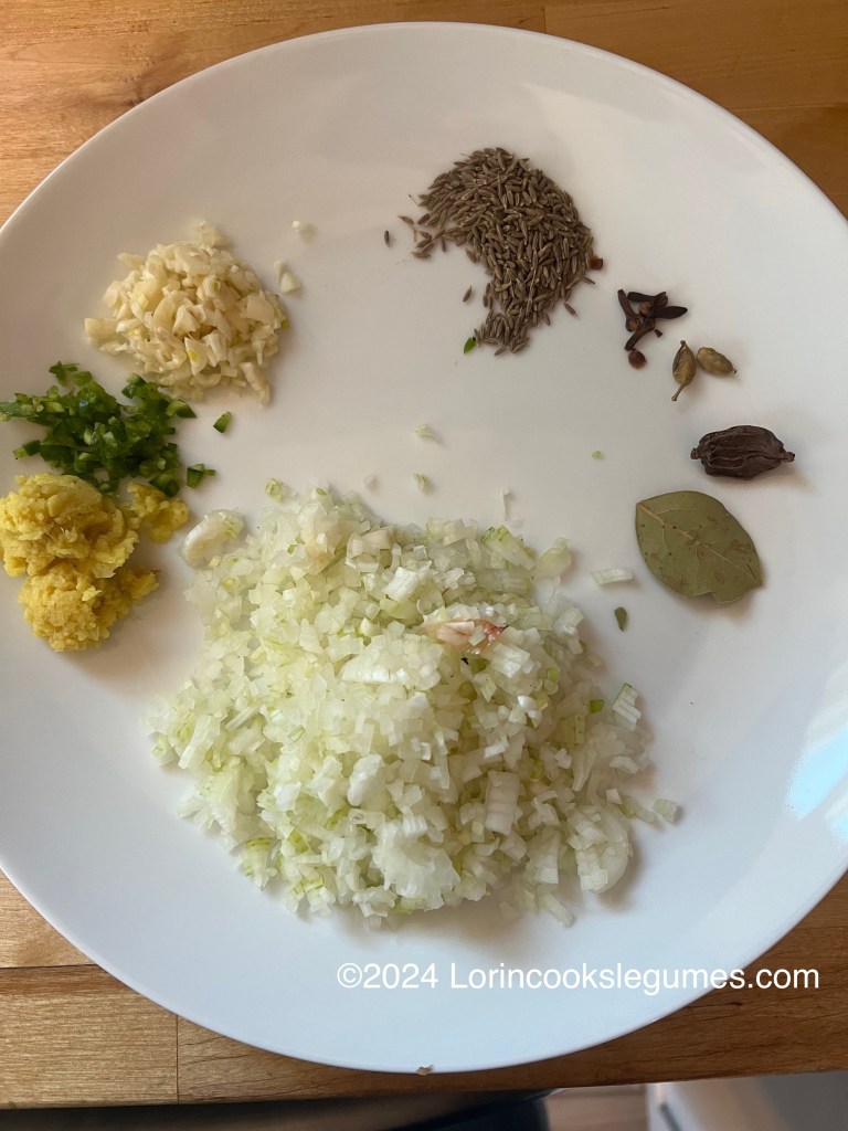 Heat oil or ghee in a large pot. Add cumin seeds, cloves, green and black cardamom pods and bay leaf. Sauté for a minute or so, until the cumin sputters. Add onion, ginger, green chili and 1 Tablespoon garlic and sauté until golden, 8-10 minutes.