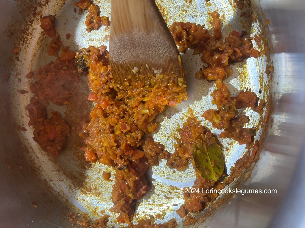 Add salt, red chili powder, turmeric, coriander, asafoetida and cumin powder. Mix well. Add tomato and sauté until tomato is soft and oil begins to separate from the mixture. Add the cooked dal along with any remaining cooking water, and mix well, lightly mashing some of the dal to thicken. .