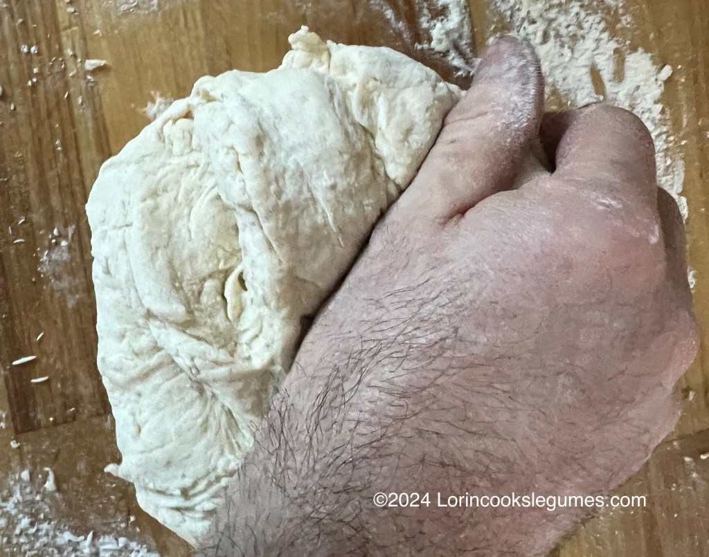 The dough will be fairly sticky. The trick is keeping it relatively sticky while you knead it. Some of the recipes I saw called for oiling your hands rather than using flour on the board while you knead. I chose to use flour, but just the bare minimum required to keep it from sticking too much. I just dipped my hands in a pile of flour and shook most of it off each time it started sticking, and maybe added a teaspoon or so to the counter a few times. I think the ideal consistency is like a Post-it-Note™; it should feel tacky, but release cleanly from your hand/ the counter when you pull away.