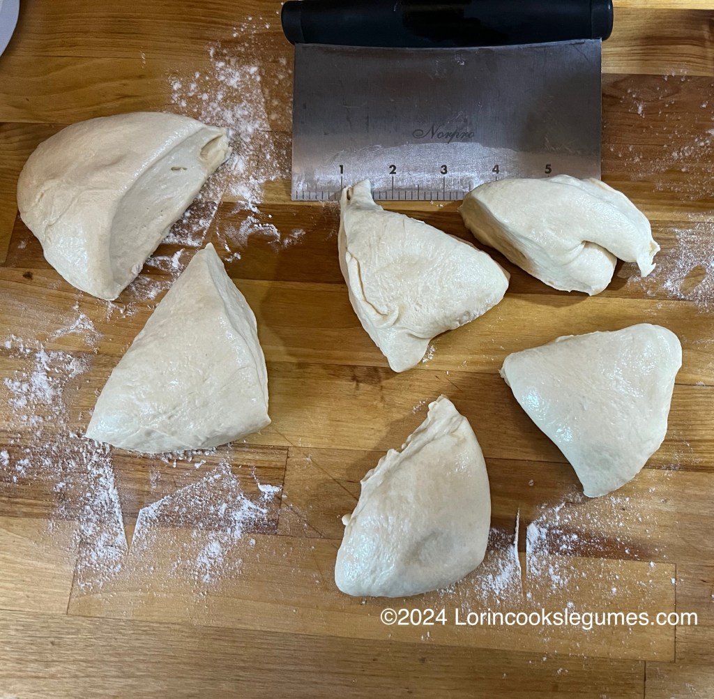 Lightly punch down the dough, then turn out onto a lightly floured surface. Divide into 6 pieces and form them into balls. Loosely cover with a towel and let rest for 5-10 minutes.