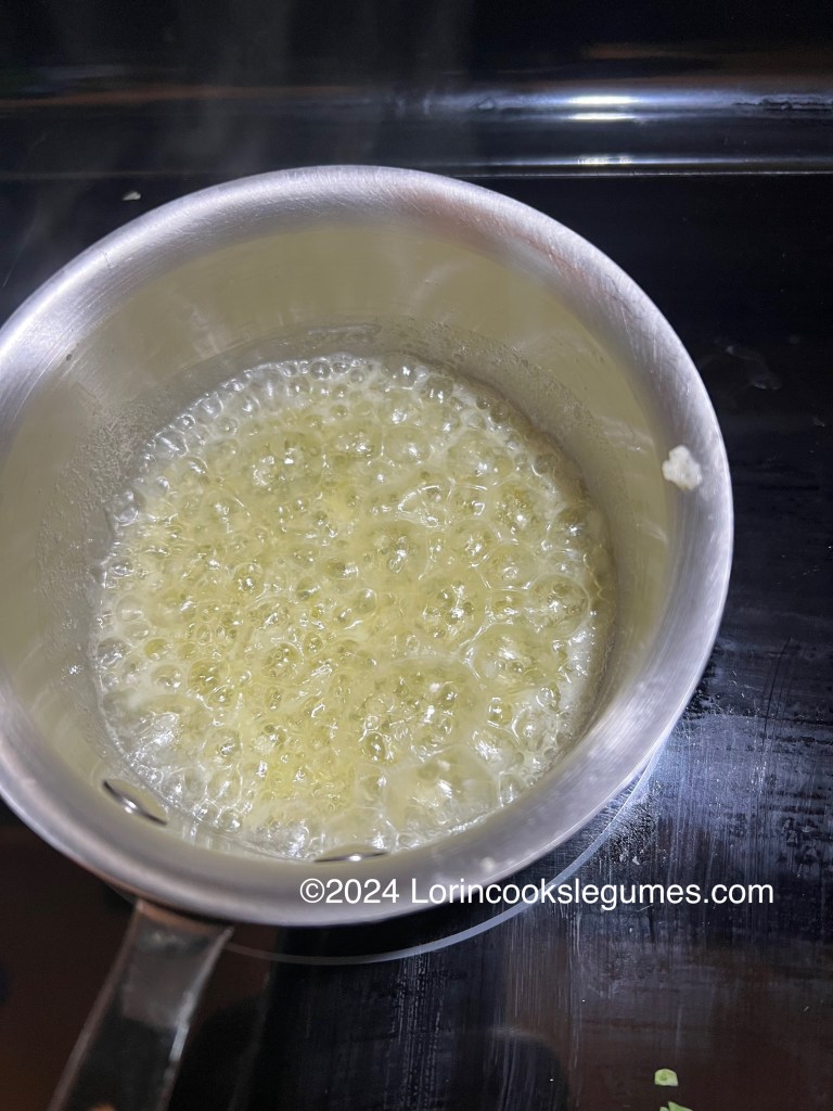 Meanwhile, melt 2 Tablespoons of butter in a small pan and add 2 cloves of grated garlic. Cook for a minute or two, then set aside.
