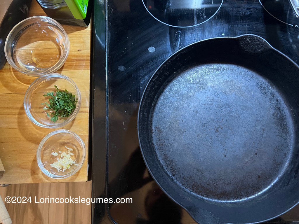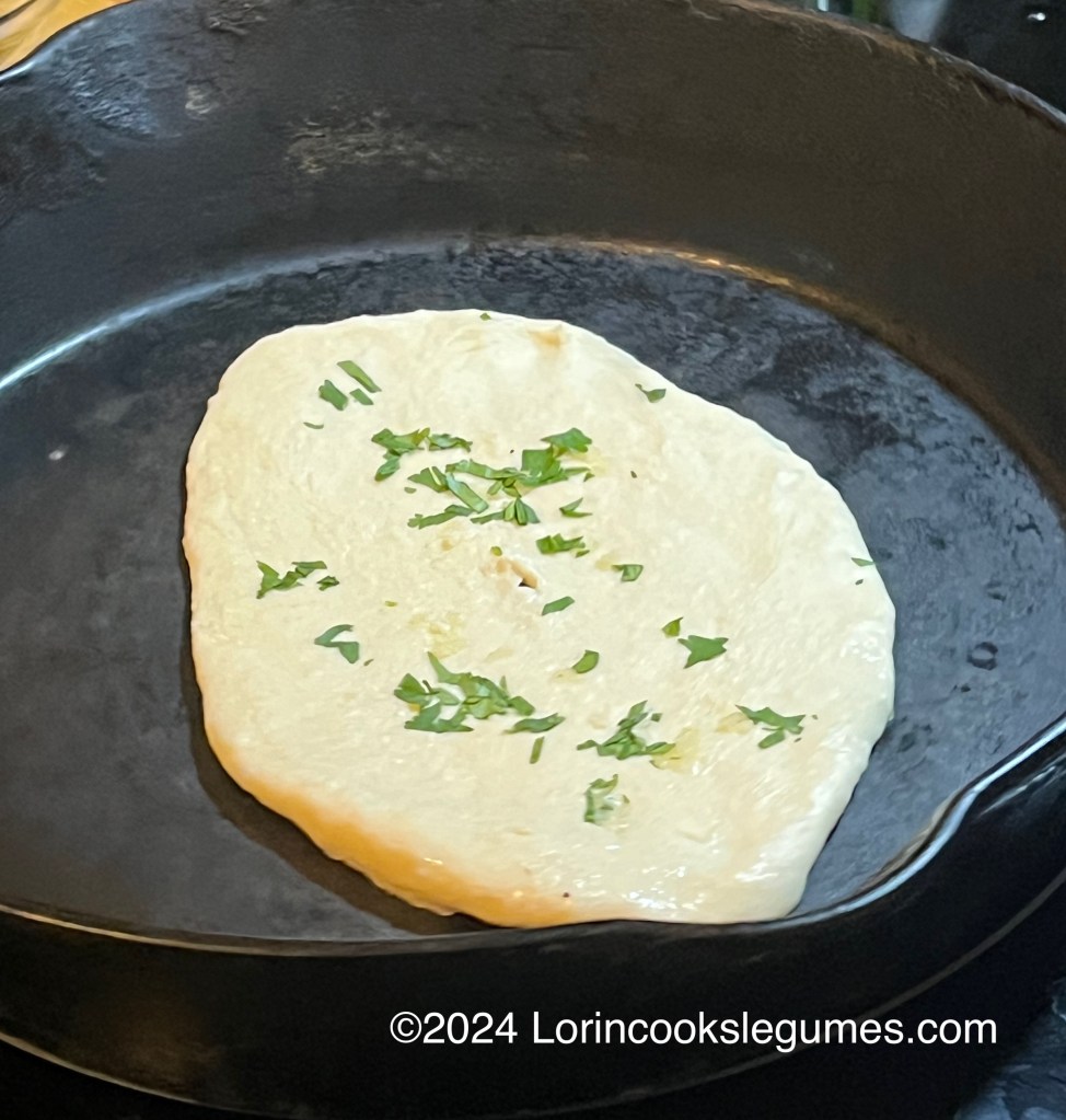Heat a cast iron skillet or other heavy bottomed, low sided, pan over medium high heat. (Don’t use a non-stick pan, as the high heat required to cook the naan will damage the non stick coating). Set a small bowl of water near your work space, along with 1 clove of grated garlic and some finely chopped cilantro.