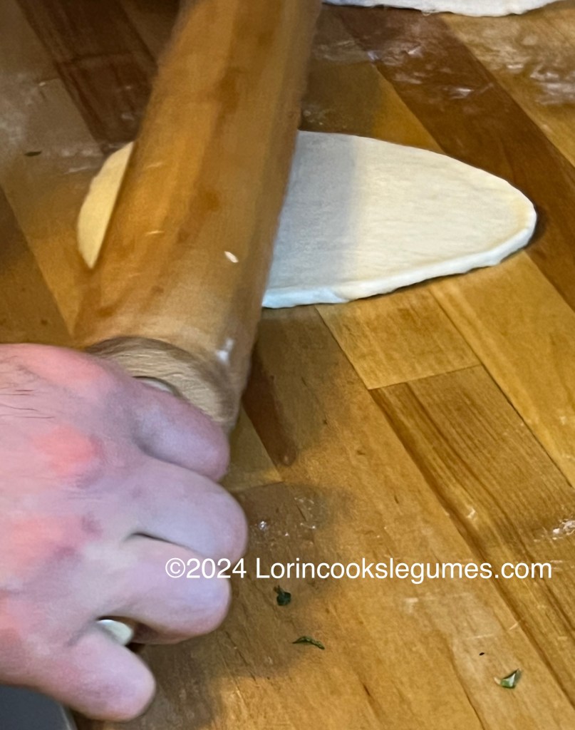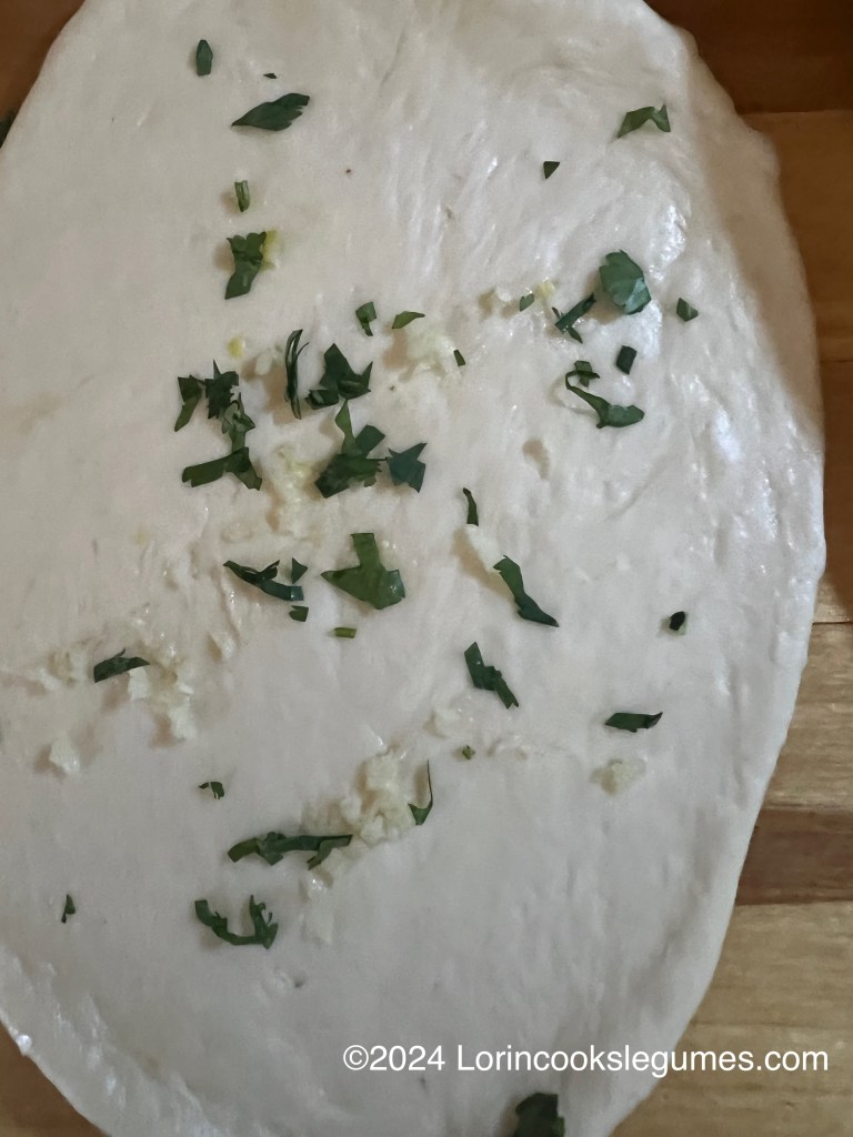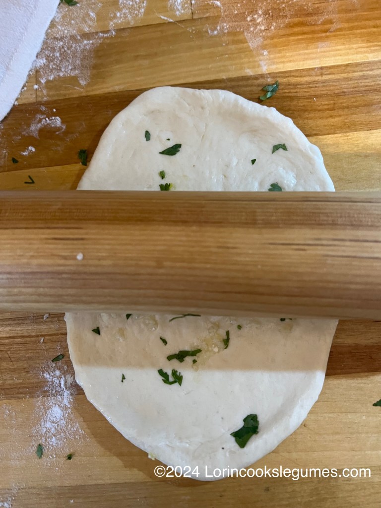 Take one ball of dough and roll it out into an oval about ⅛ inch thick. Roll from the center off the edges, rather than back and forth. Sprinkle a pinch of garlic and some cilantro over the dough and lightly press in with the rolling pin. Break a small hole in the center of the dough (this will encourage the dough to make many small bubbles rather than one large one).