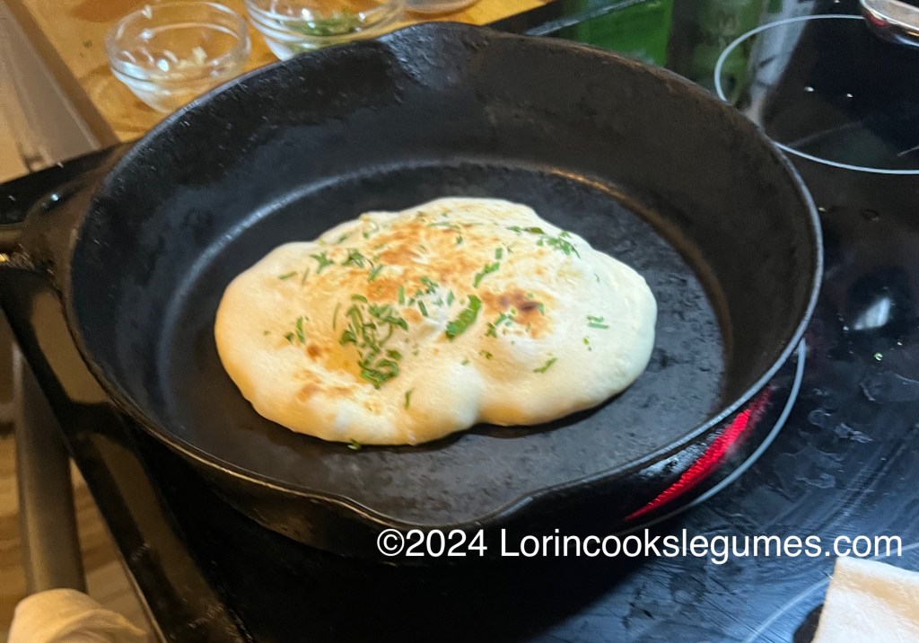 If you have an induction stove, or don’t want to hold your pan upside down, you can just flip the naan in the pan and cook the other side on the pan. You won’t get quite the same effect, but it will still be delicious. (Skip wetting the dough if you do this).