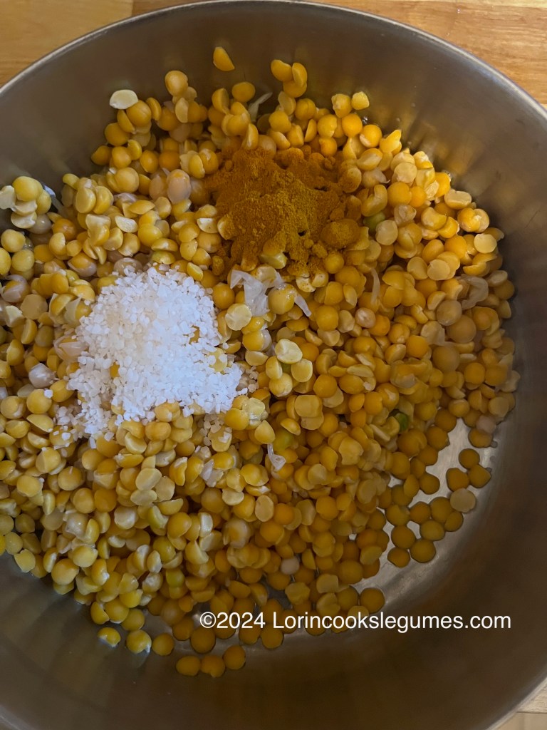 Bring 5 ⅔ cups water to a boil and add the soaked peas, turmeric and 1 ½ teaspoons of salt. Reduce heat and simmer for 20-40 minutes, until peas are just tender. They should still hold their shape, but mash easily between your fingers, with no grittiness. Check frequently and do not over cook. Drain peas in a strainer and spread in a shallow layer on a large plate or baking sheet. Leave to cool completely.