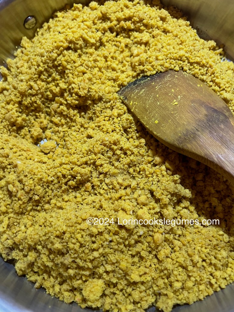 Heat 2 Tablespoons of oil in a wide pan over medium low heat, and add the ground peas. Cook, stirring constantly, for 5-10 minutes, until the mixture is somewhat dry and crumbly. Set aside to cool.