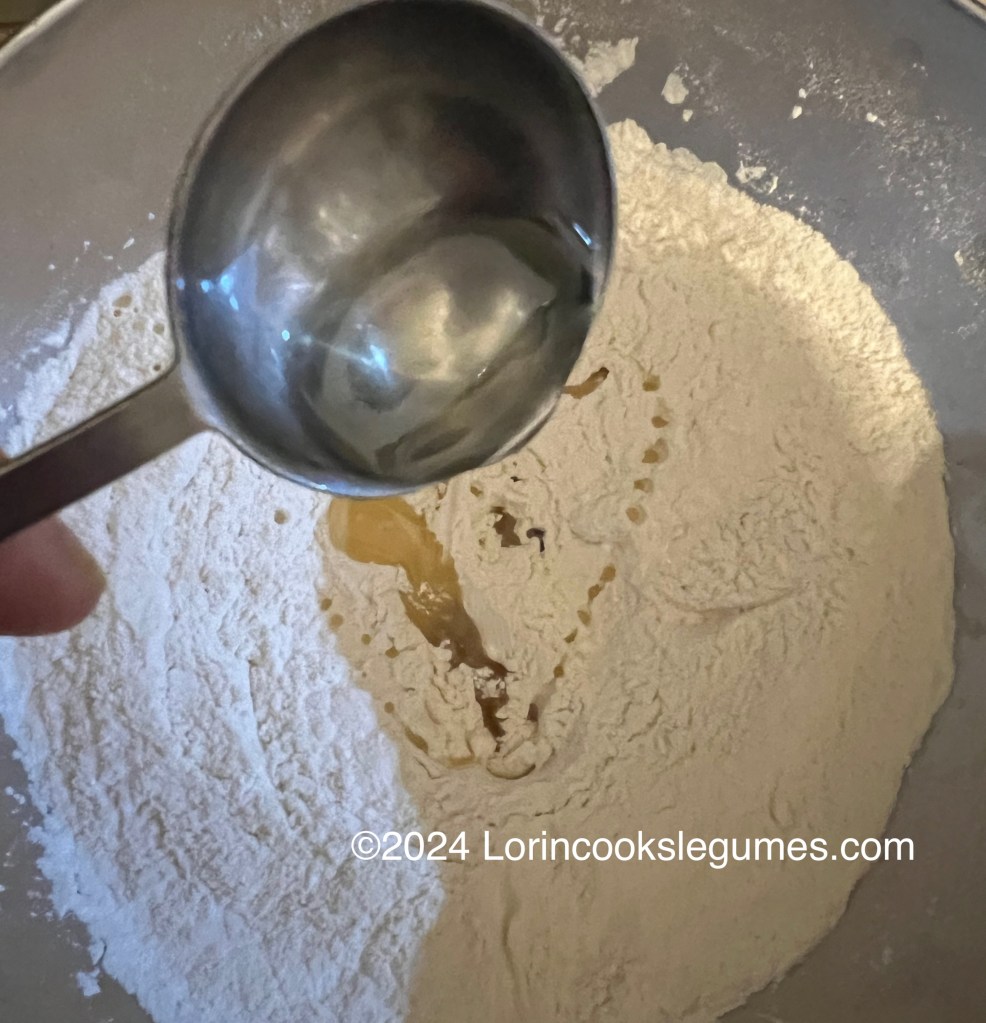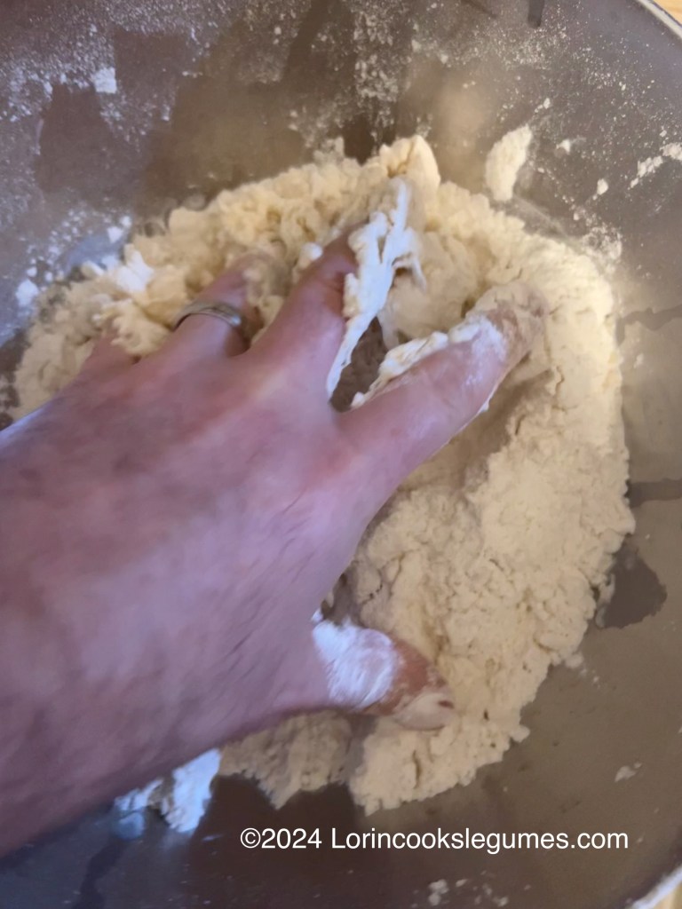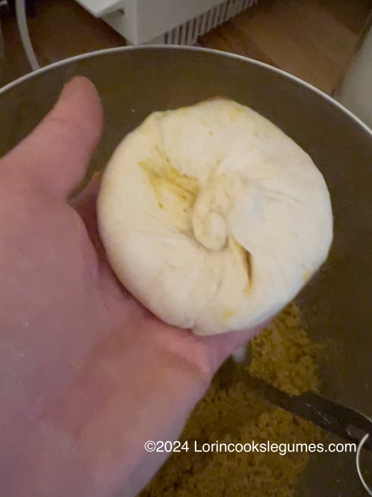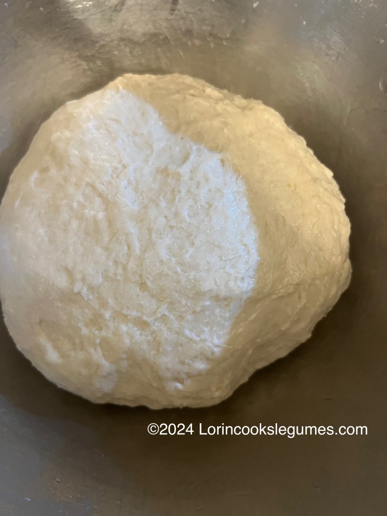Most of the recipes I looked at recommended mixing the dough with your hand. You’re looking for a soft, fairly sticky dough. I didn’t wind up using quite the full 1 ½ cups of water, more like 1 ¼, and kneaded directly in the bowl, using a “grab and twist” method, until the dough came together into a ball. One trick I did learn from my research was that if the dough seems too sticky, don’t jump straight to adding more flour- first wash the dough off your hand and dry them, then dip your hand if flour and knead again to see if that makes a difference. Because we want a soft, sticky dough adding minimal amounts of flour at this stage is essential, and often the problem is solved by getting sticky dough off of our hands.