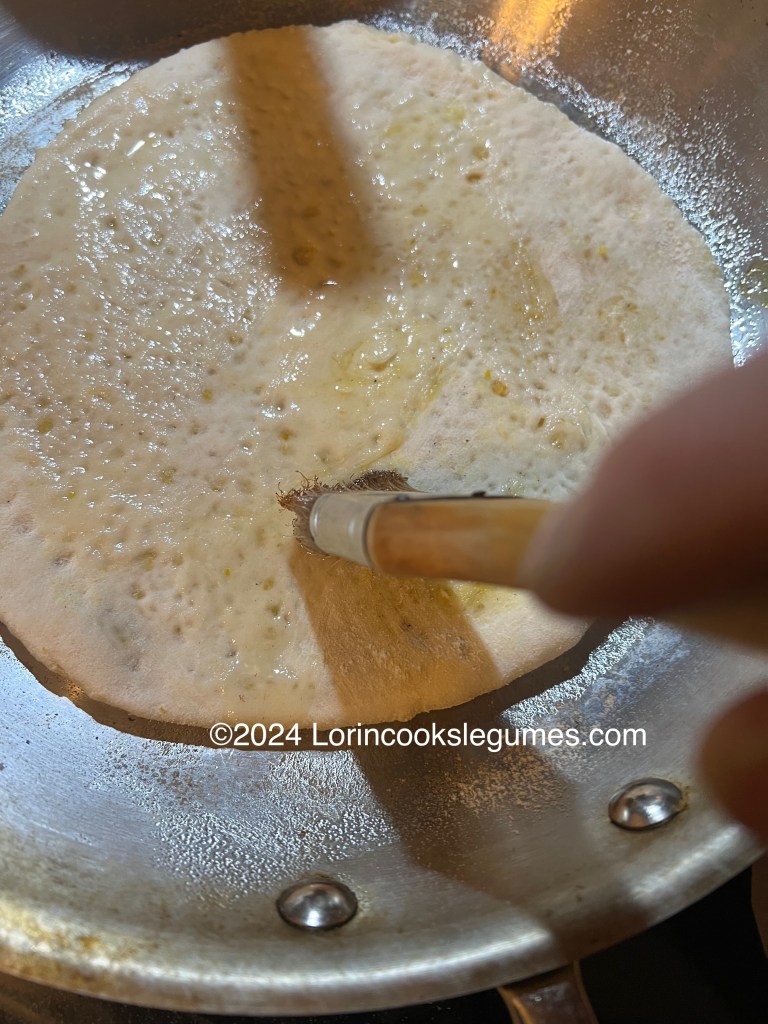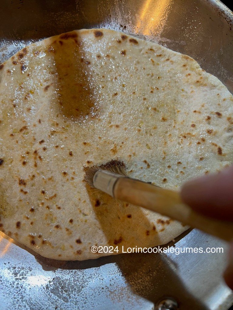 If you don’t have a heat proof pastry brush to brush oil on your pan and roti, the traditional method is apparently to dip the bottom of a metal cup in the oil and then rub it across the surface. You can also use the back of a spoon, or a silicon basting brush would be ideal. I was dumb and destroyed one of my pastry brushes that was apparently not heat resistant. Don’t be like me.