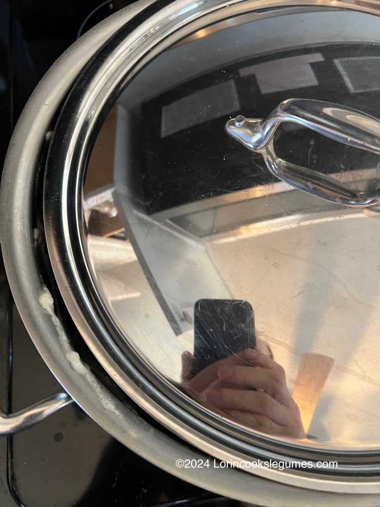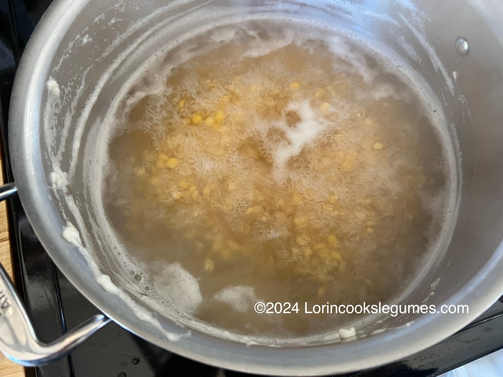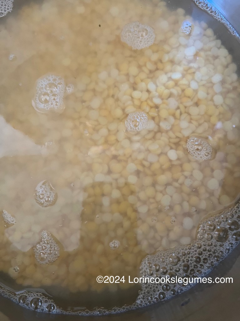 Drain the peas and add them to a pot with 7 cups of water. Bring to a boil, skimming off any scum that rises to the surface.