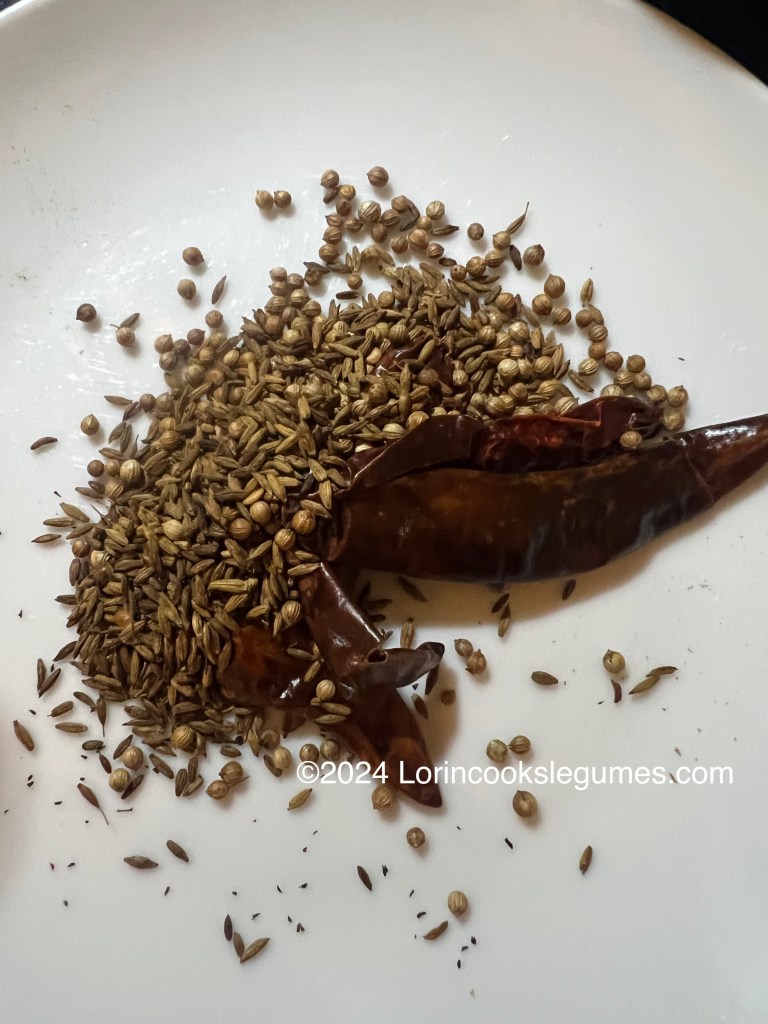 Most recipes say that the defining flavor of ghugni is bhaja masala, which is sprinkled on as a garnish. Of course, when you go to find out what goes into bhaja masala, there’s almost no consensus! Some versions were as simple as cumin seed and red chilies, while other’s had 5-10 other ingredients included! I kept it simple at three ingredients; cumin, chilies and coriander, but list a few other ingredients in the optional category. Besides the masala, other common garnishes include coconut, onion, green chilies, cilantro and tamarind water. I also saw recipes using cucumber, fresh ginger, and even fresh tomato.