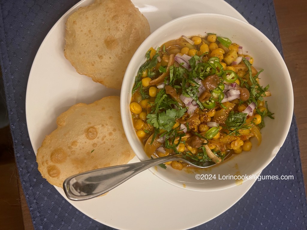 As is typical when I research Indian recipes, the suggestions for what to serve on the side are all over the place. I made luchi, which is a deep fried bread made with all purpose flour, salt, water and ghee. Another popular accompaniment/topping is puffed rice. Regular cooked rice or roti would also be perfectly acceptable.