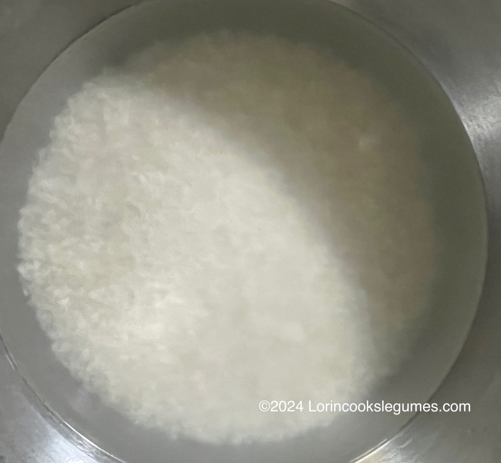 About half an hour before you are ready to grind your rice and beans, you want to soak a little bit of poha,* or flattened rice (basically the rolled oats of the rice world). This ingredient helps to make light fluffy idlis.