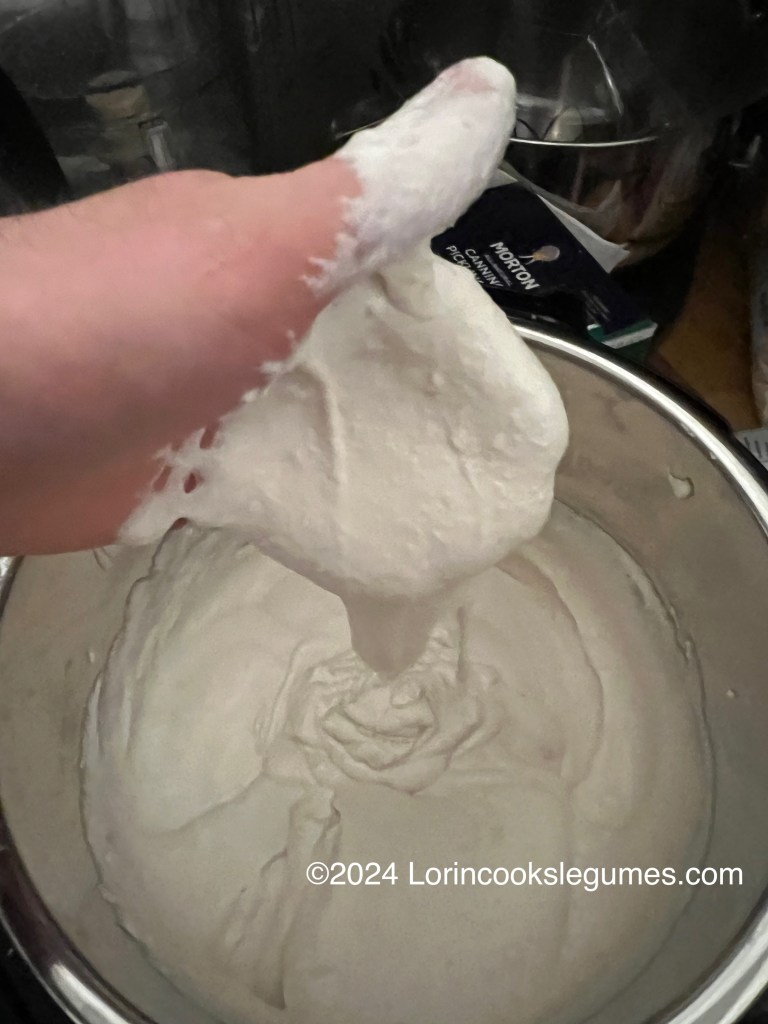 Once mixed, the batter must sit in a warm place for many hours until it ferments. In a tropical climate this could be as fast as 6 hours just left on the kitchen counter. In colder climates we need to help it along by creating a warm place for it to work, Ideally around 90 degrees. The most common suggestion is to preheat your oven to its lowest setting, turn it off, and let it cool for 10-15 minutes (depending on how low the lowest setting is), then place the covered bowl of batter inside. If your oven has a light, turn it on to generate a little extra heat. Probably the best method, however, is an Instant Pot* (or similar device) with a yogurt setting. Use the low setting set to at least 12 hours. (For my first batch I set it on medium, left the house for an hour or two to go see the northern lights, and came back to find the batter at about 110F.)