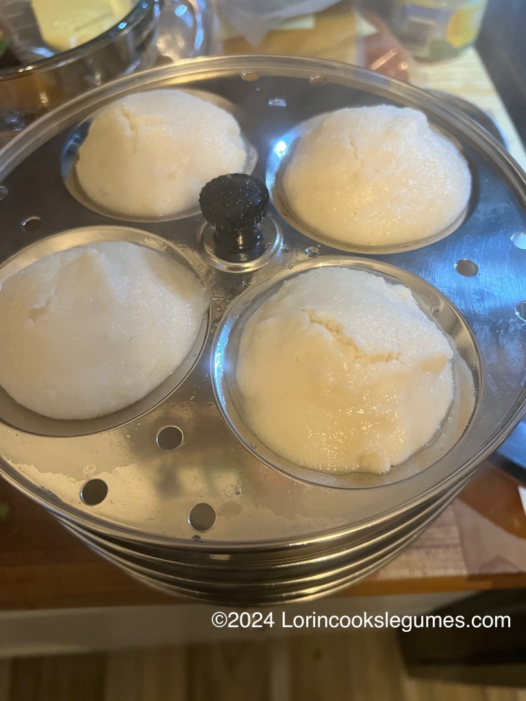 A traditional Idli steamer* consists of a pot and several metal plates with shallow indentations in them that stack together on a central rod. I purchased just a stand* and used one of my stock pots. If you don’t want to invest in an idli steamer, you could just use small ramekins or shallow bowls, although this might take many batches to cook very many, and you might not get the traditional shape.