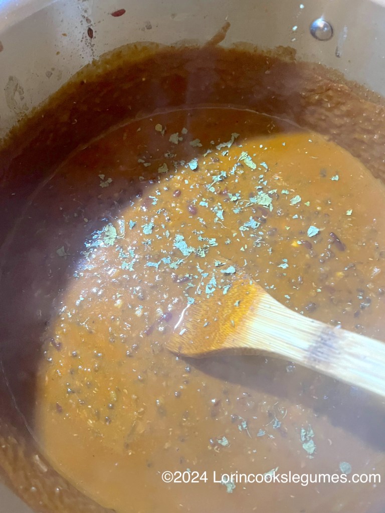 Add the beans and all their water and mix well. Add an additional 1⅓ cup water and continue to simmer, stirring frequently to prevent sticking, for about 30-40 minutes, until the flavors have melded and the mixture has a nice, creamy consistency. Add additional boiling water as needed if the mixture is too thick.