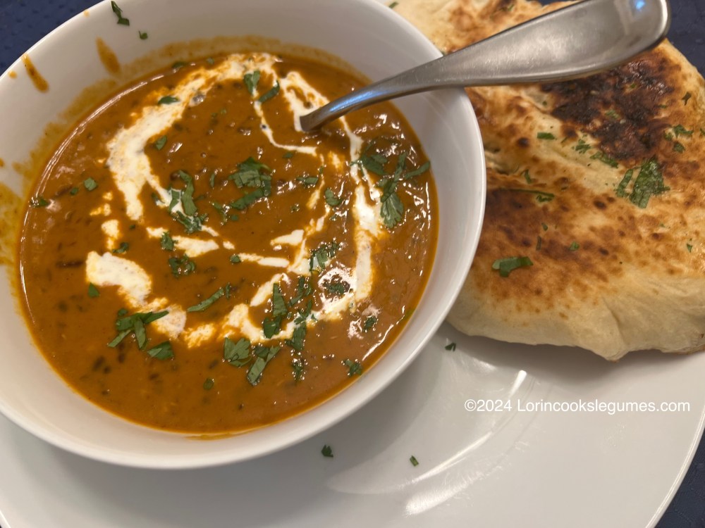 Serve, garnished with a drizzle of cream and some fresh cilantro, accompanied by garlic naan, roti, paratha, or rice.