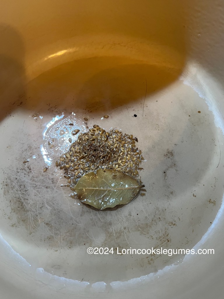 Heat oil in a heavy-bottomed pot. When oil shimmers, add cumin seeds and bay leaf. Fry until cumin sputters, 15-30 seconds. Add the onion and sauté until golden, 8 minutes or so.