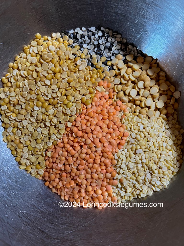 Combine the five types of dal in a bowl and pick over them, removing any foreign objects or bad beans. Rinse in several changes of water, until water runs clear. Cover with cool water by at least an inch and leave to soak for an hour or so.