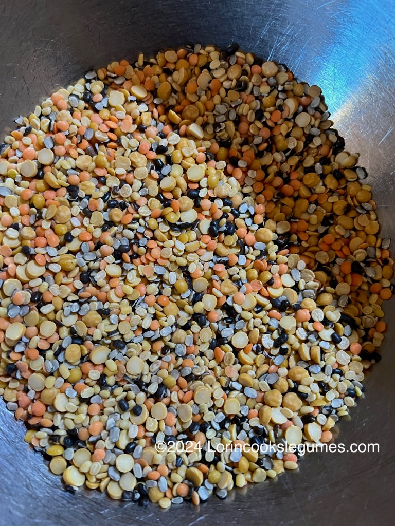 The five types of dal used are India’s 5 most common dals: toor, moong, urad, channa, and masoor. Generally, the moong and urad used are split but still have skins, and some recipes even called for these two dals (and maybe also the masoor dal) to be whole beans rather than split. I didn’t have any moong dal with skins on hand so I chose to use the hulled product I already had in the pantry rather than buying another product when I only needed a ¼ cup. If you don’t have a pantry full of beans like I do, you can also buy a premade mix* rather than buying individual bags of 5 different lentils.