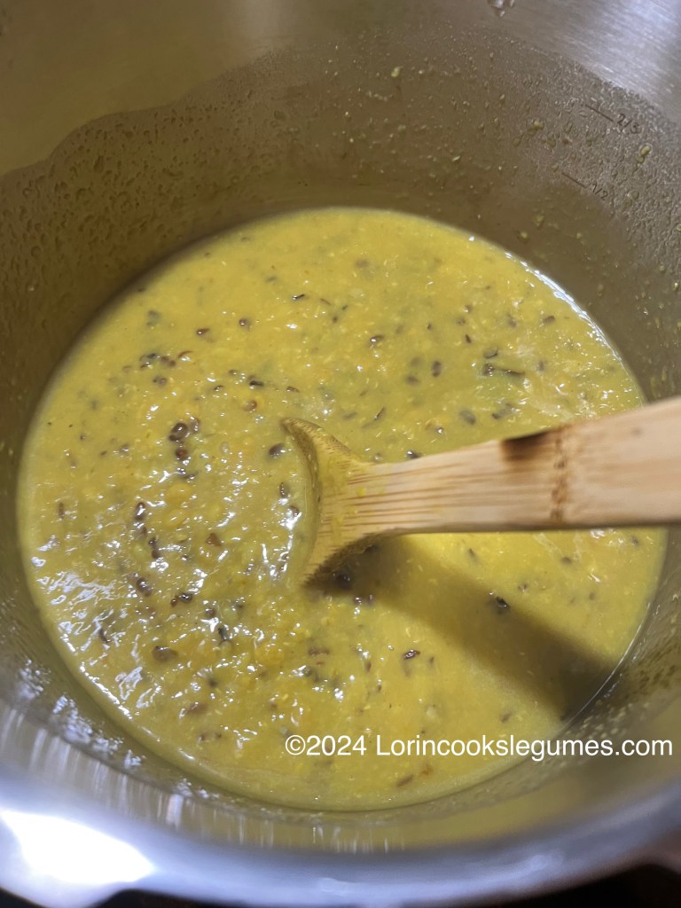 Drain the dal and place it in a pressure cooker, along with 2 ¾ cups water, ⅜ teaspoon turmeric, ¼ teaspoon salt, 2 bay leaves, and 1 ¼ teaspoons of ghee. Seal the lid and bring the cooker up to pressure. Cook for 8-10 minutes on high pressure, then allow the pressure to release naturally. When safe to do so, open the pressure cooker and check your dal. It should be thoroughly cooked, but still retain some individual grains. If necessary, add a little hot water to achieve a medium-thick consistency.