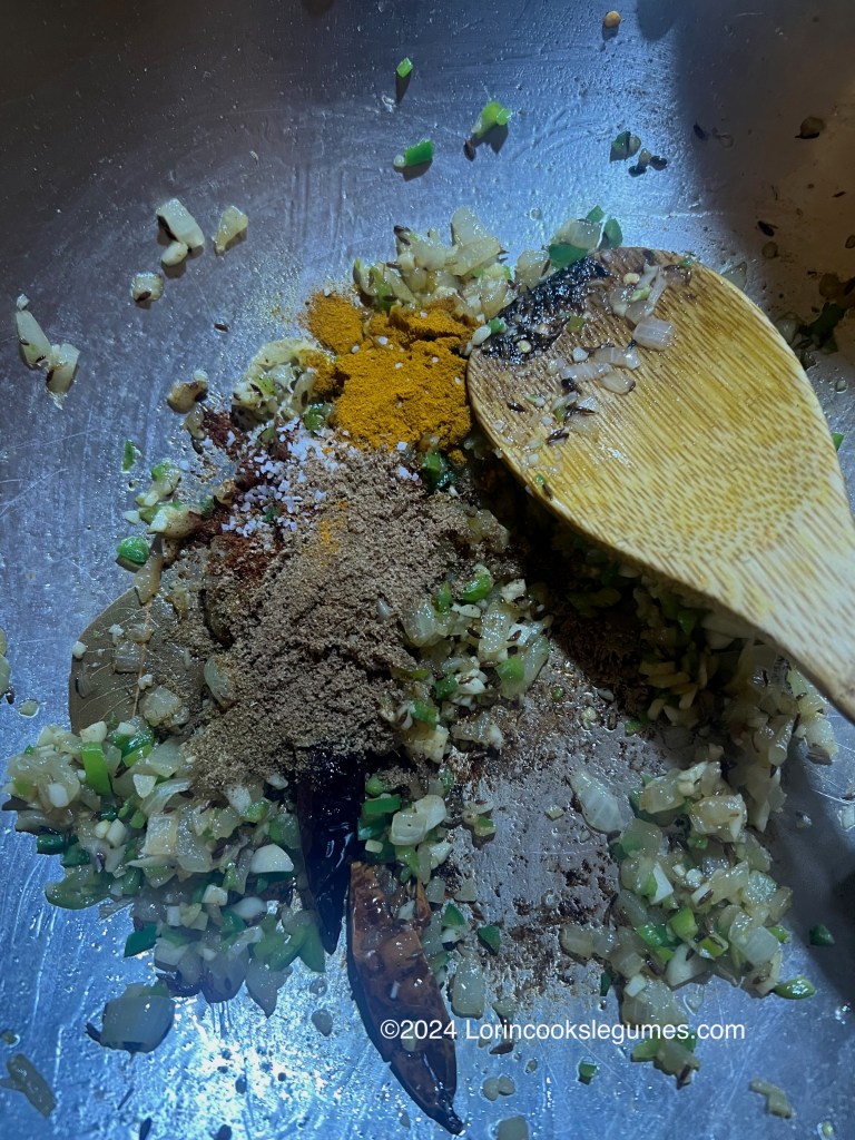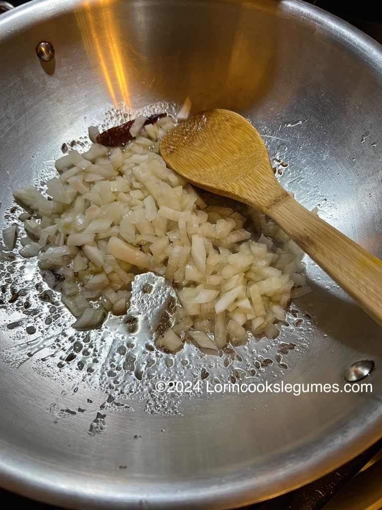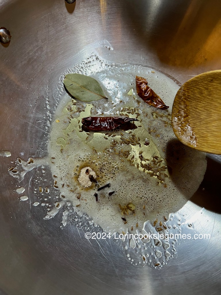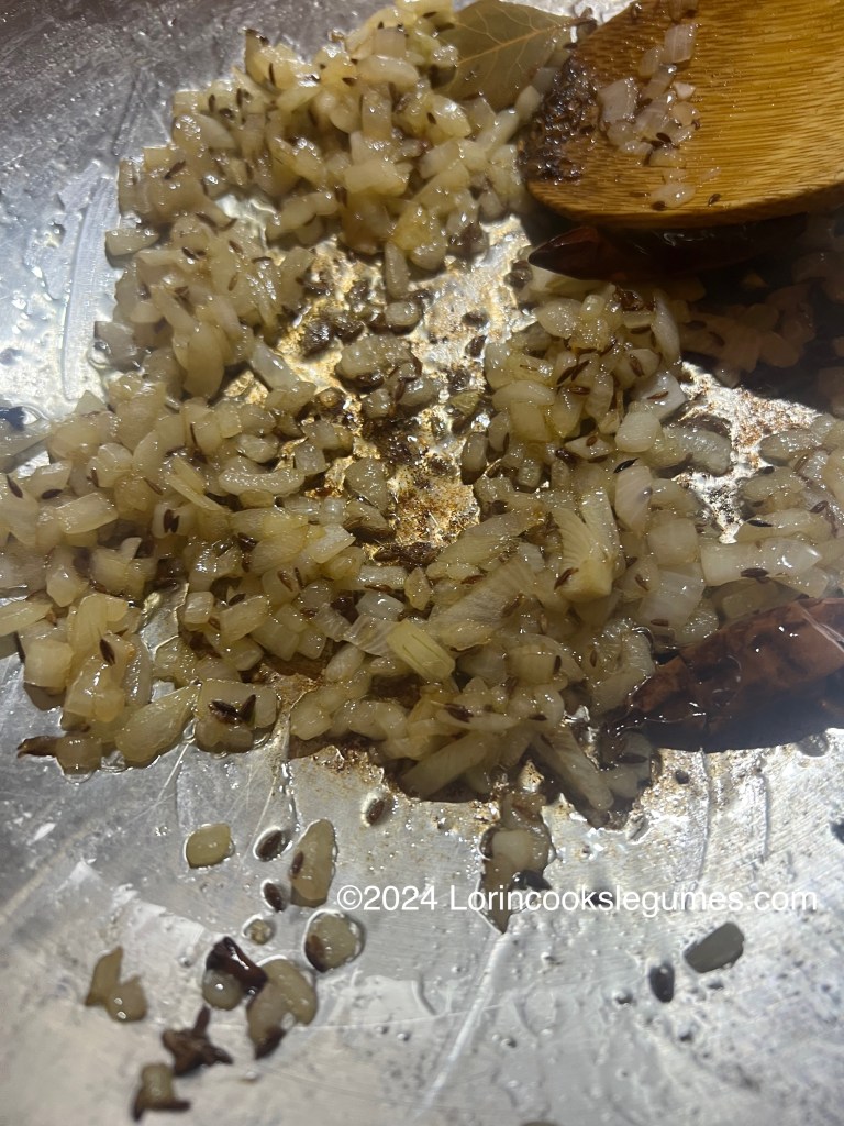 Heat 2 Tablespoons of ghee or oil in a frying pan or heavy-bottomed pot. Add 1 teaspoon cumin seeds and cook until they sputter. Immediately add asafoetida, cloves, 2 dried red chilies, and 1 bay leaf. Cook for 30 seconds or so, until fragrant. Add the onion and fry until golden, 5-8 minutes.