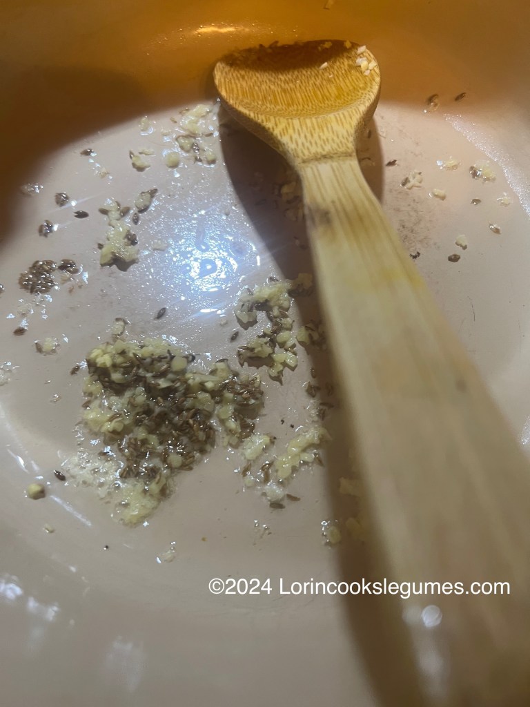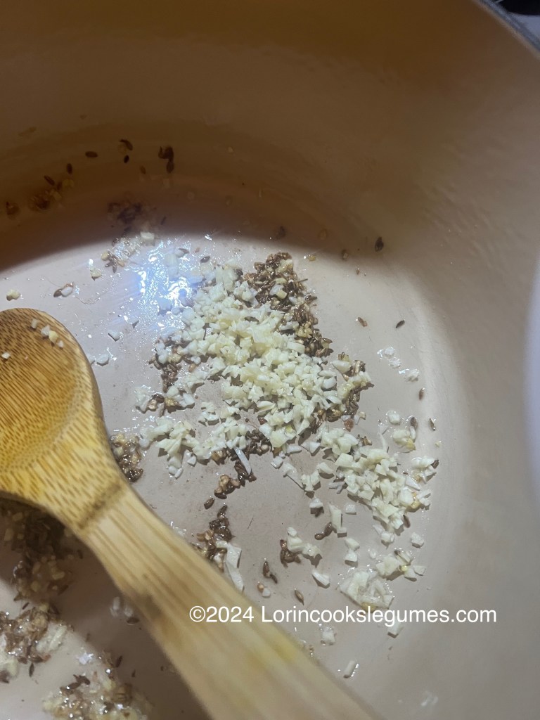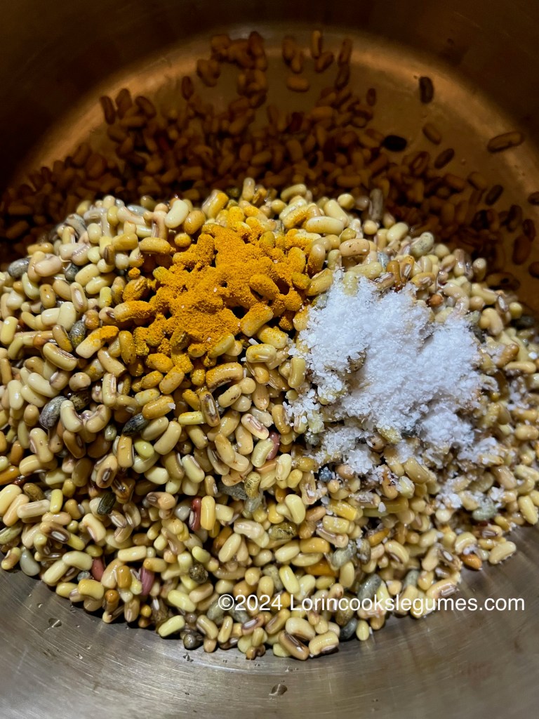 Drain the beans, rinse again, and transfer to a pressure cooker, along with ⅓ teaspoon turmeric and 1 ½ teaspoon salt. Cover with water, seal the pressure cooker, and bring up to pressure. Cook for about 8 minutes, then let the pressure release naturally.