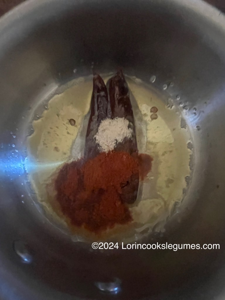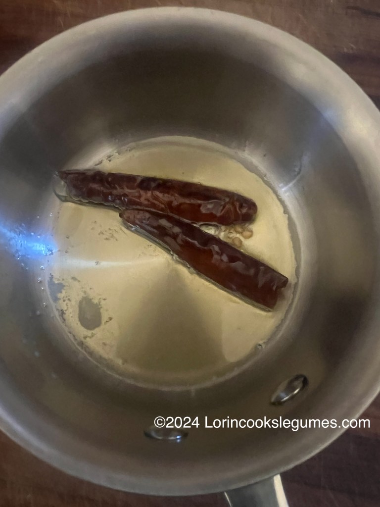 Heat ghee in a small pan until nearly smoking. Remove from heat and add the dried red chilies. Allow to fry in the hot oil for about 30 seconds, then add the asafoetida and ½ teaspoon of red chili powder. Mix well and pour over the dal.