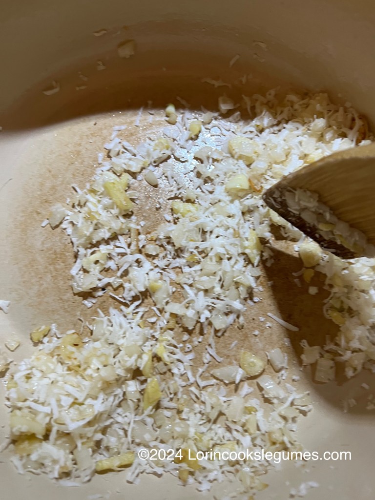 Meanwhile, heat ¾ Tablespoon neutral oil in a large pan. Add garlic and ginger and cook until the raw smell goes away. Add ½ cup onion and sauté until golden. Add coconut and continue to sauté over low heat, stirring constantly, until coconut is golden brown. Transfer mixture to a plate and allow to cool completely.