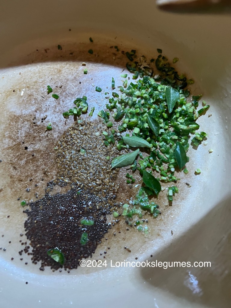 In the same pan you cooked the coconut in, heat 1 ½ Tablespoons oil. Add mustard seed and cumin seed and cook until they sputter. Add curry leaves, asafoetida, and green chilies, and cook for a few seconds, until leaves are crisp. Add 1 large onion and sauté until golden.